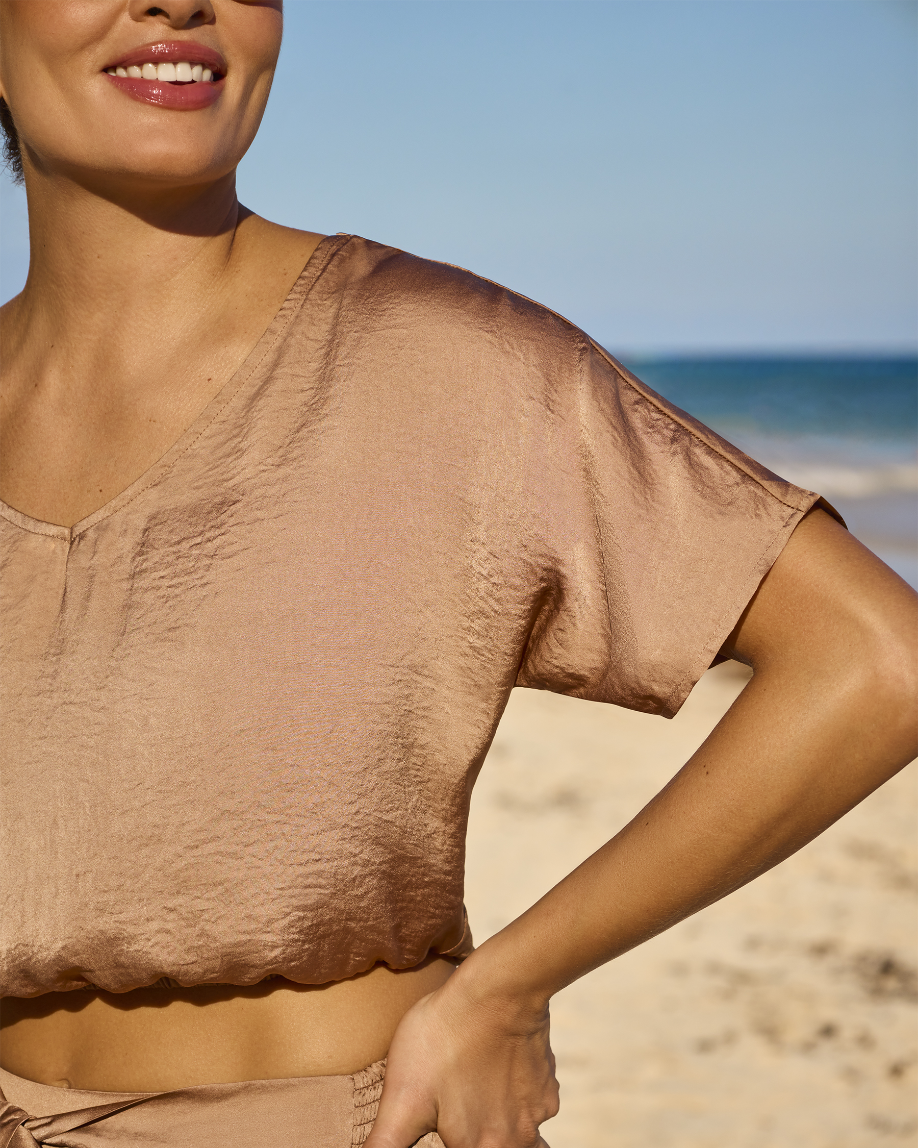 This satin top brings a touch of sophistication to any outfit. Its luminous fabric reflects the light, creating an effortlessly chic effect. The cropped cut gives it a modern silhouette, perfect for styling refined looks from morning to night. The elastic band provides comfortable support while subtly enhancing the figure. In its warm, enveloping brown shade, this top becomes a versatile essential that pairs just as well with casual outings as it does with more polished ensembles.
